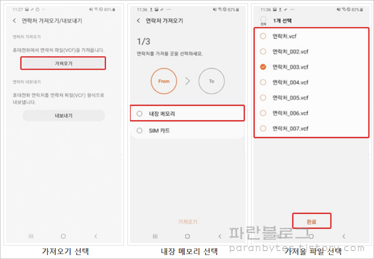 핸드폰 연락처 > 메뉴 > 연락처 관리 > 연락처 가져오기/내보내기 > 가져오기 > 가져올 파일이 저장된 위치 선택 (SIM카드, 내장메모리 또는 SD카드) > 가져오기