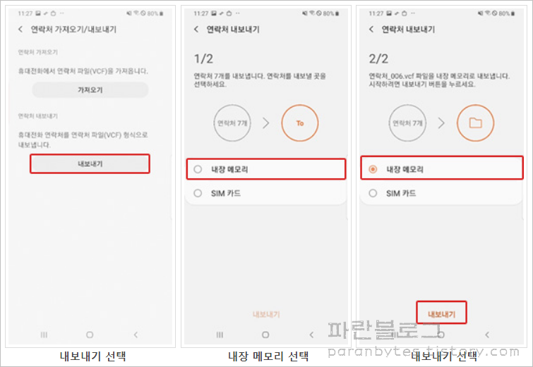 1. SIM카드, 내장, 외장메모리로 내보내기/SIM카드, 내장, 외장메모리에서 가져오기