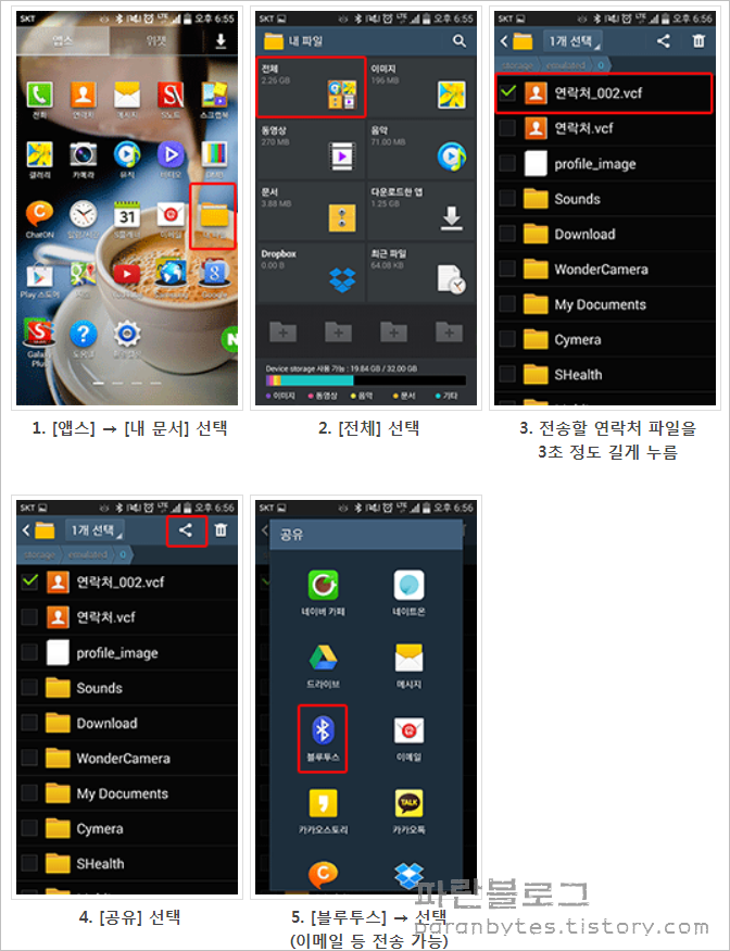 연락처 파일을 저장했으면 두 기기모두 블루투스 기능을 켜고 내문서/storage/emulated/0 경로에서 전송할 연락처 피일을 선택한 뒤 공유>블루투스를 선택합니다. 블루투스 외에도 이메일, 카카오톡, 구글드라이브 등에 전송가능합니다.