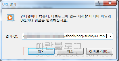 ▼ [URL열기] 창에 앞서 복사한 주소를 붙여넣기[Ctrl+v] 한뒤 확인을 클릭합니다.