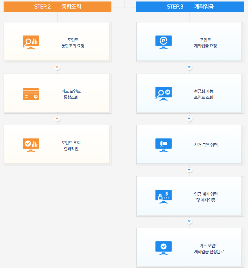 ▼ 여신금융협회 카드포인트 통합조회&계좌입금 사이트로 들어가서 가운데 [통합조회&계좌입금]을 클릭해 순서대로 단계를 따르면 어렵지 않기 포인트 출금을 신청할 수 있습니다.