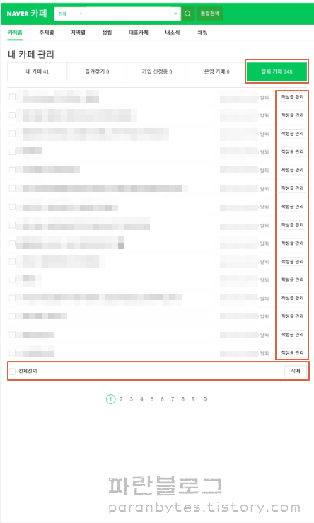 ▼ 내카페 관리 중 [탈퇴카페] 탭으로 들어갑니다. 목록 중 삭제를 원하는 항목을 선택하거나 [전체선택] 후 하단의 [삭제]를 클릭하면 선택한 목록이 삭제됩니다. 또한 [작성글 관리]를 클릭하면 해당 카페에 작성된 내글과 댓글 목록을 확인할 수 있으며 원하는 항목을 삭제할 수 있습니다. 단, 답글이 있는 글은 삭제가 되지 않습니다.