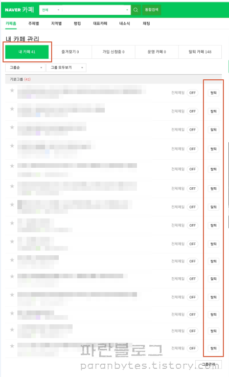 ▼ 가입한 카페목록일 모두 확인할 수 있습니다. 여기에서 전체메일 수신하지 않도록 설정하거나 탈퇴를 진행할 수 있습니다.