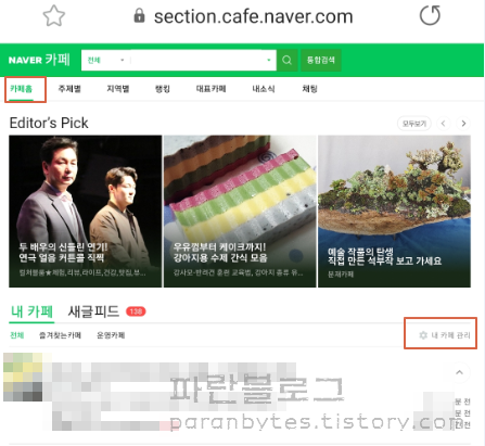▼ 네이버앱에 로그인 후 카페홈에 들어가서 하단의 [PC버전]을 클릭합니다. 내카페 목록 윗부분에 [내카페관리]로 들어갑니다.