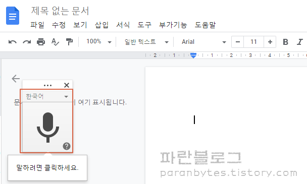 ▼ 음성입력 창이 열리면 왼쪽에 [마이크] 모양의 아이콘이 생성됩니다. 마이크모양 바로 위 [한국어]를 클릭하면 감지할 언어를 다른 언어로 설정할 수 있습니다. 변환할 음성파일을 재생한 뒤 마이크 아이콘을 클릭합니다.