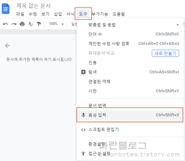 ▼ 새 문서창이 열리면 [도구]에서 [음성입력]을 클릭합니다.