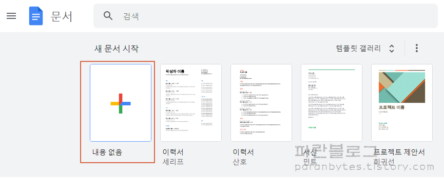 ▼ [새 문서 시작] 탭에서 템플릿을 확인할 수 있습니다. 음성파일을 받아쓰기할 것이므로 템플릿이 없는 [내용없음]을 클릭합니다.