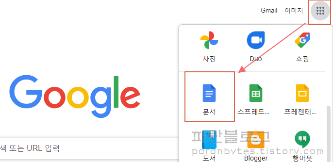 ▼ 구글 창을 열고 로그인 후 [구글앱] 메뉴를 클릭합니다. 앱 목록이 나타나면 스크롤을 아래로 내려 [문서]를 찾아 클릭합니다.