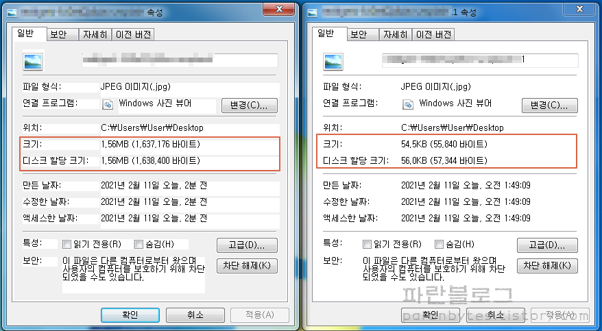 ▼ 사진 용량줄이기 그림판 이용 결과를 확인해보겠습니다. 작업 전과 후의 파일 속성을 각각 열고 비교해보니 작업전의 크기 1.56MB가 크기 조정 후 54.5KB로 감소되었습니다.