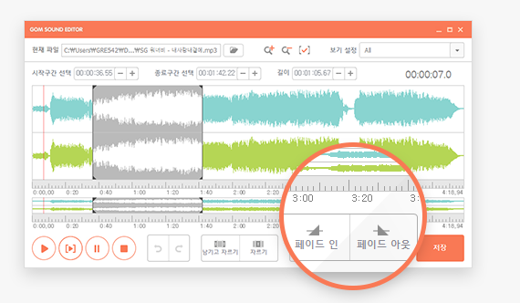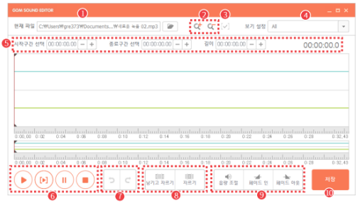 9. 음량편집 : 음량을 조절하거나 페이드 인/아웃을 실행할 수 있습니다.