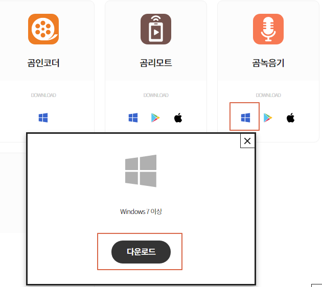 ▼ 곰녹음기의 윈도우아이콘을 클릭하면 PC버전의 설치가 가능합니다. 윈도우7이상 지원합니다. 모바일 앱 이용을 원하는 경우 구글플레이스토어 또는 애플앱스토어 아이콘을 클릭하면 앱설치페이지로 이동합니다.
