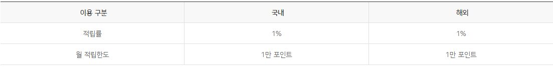 상세내용 ![]() 국내 및 해외 이용금액의 1%를 네이버페이로 적립해줍니다. 적립한도는 국내/해외 각 1만포인트입니다. 연회비가 5,000원 발생하는 부분은 아쉽지만 전월실적 조건이 없는 장점이 있습니다. 포인트 적립은 매출표 접수일을 기준으로 익월 15일에 일괄 적립됩니다.