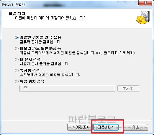 삭제된 위치를 알고있는 경우 범위를 지정할 수 있습니다. 이렇게 검색범위를 지정하면 검색에 필요한 시간을 단축할 수 있으나 정확한 위치가 확인되지 않는 경우 확실한 위치를 알수 없음을 선택합니다.