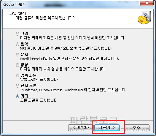 ▼ 다음으로 복구할 파일 형식을 선택합니다. 그림이나 음악, 문서, 압축파일 등 포맷을 지정하거나 모든 형식의 파일 복구를 원한 결우 기타를 선택한 뒤 다음으로 진행합니다.