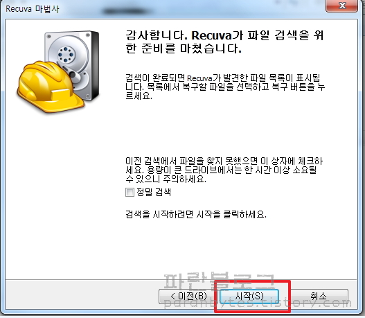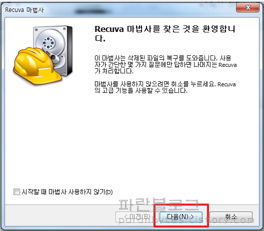 ▼ 마법사를 실행한뒤 [다음]을 클릭해 recuva 한글 프로그램 설치를 시작합니다.