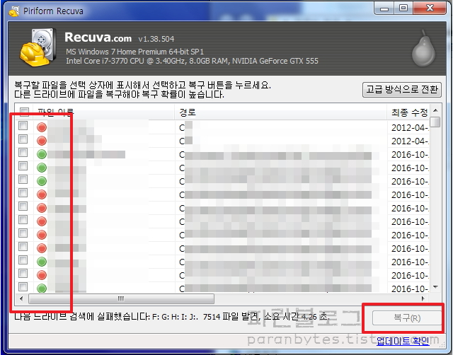 ▼ 검색결과는 복구가능한 파일(녹색)과 불가능한 파일(빨간색)으로 표시되며 주황색아이콘은 복구여부를 확신할 수 없는 파일에 대해 보여집니다. 해당항목을 체크하면 아래 복구 버튼이 활성화되어 작업을 진행할 수 있습니다.