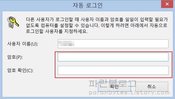 3. [자동 로그인] > [암호] 입력 >[암호확인] 입력 > 로그인 설정 변경 완료