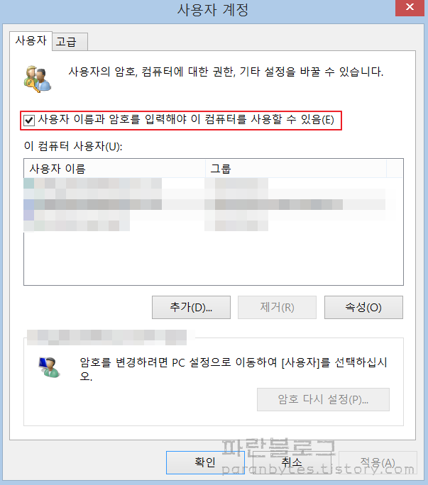2. [사용자계정] > [사용자] > [이름과 암호를 입력해야만 PC를 사용할 수 있음] 항목을 체크 해제 >[확인]