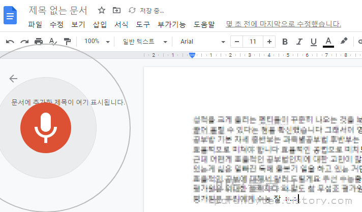 구글문서는 실제로 자주 사용하는 기능인데 음원 품질에 따라 결과가 많은 차이를 보입니다. 인식이 잘 되지 않을 경우 텍스트화가 진행되다가 멈추기도 하기 때문에 회의중이나 강의중에 변환기능을 바로 사용하기보다 먼저 녹음한 뒤 음성파일을 변환하는 방법을 추천합니다. 사용방법은 매우 간편합니다.