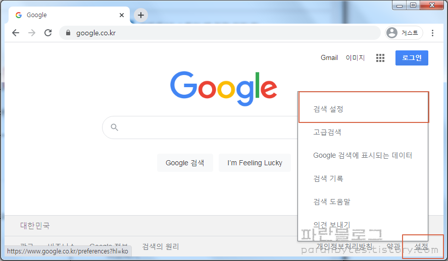 ▼ 구글 창을 열고 오른쪽 하단의 [설정]을 클릭해 [검색설정]으로 들어갑니다.