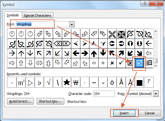 ▼ 폰트를 [Wingdings]로 선택하거나 입력한 뒤 원하는 모양의 기호를 찾아 넣습니다. 빈체크박스는 비어있는 네모모양을 선택하고 체크표시된 박스는 스크롤을 내려 찾아 넣습니다.
