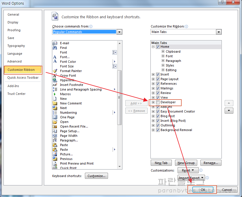 ▼[리본 메뉴 사용자 지정]을 선택한 뒤 기본탭에서 [개발도구]에 체크하고 [확인]을 클릭합니다.