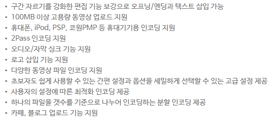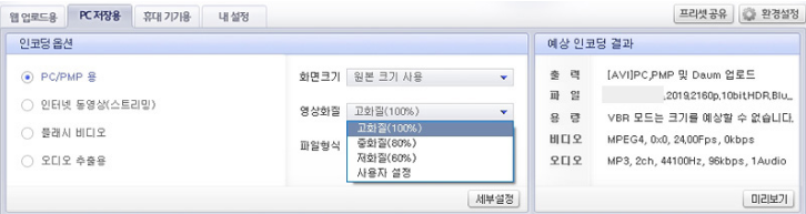 인코딩 옵션에는 [웹업로드용], [PC 저장용], [휴대기기용]이 있으며 [내설정]에 사용자가 직접 추가할 수 있습니다. 전반적인 옵션은 기기에 맞춘 최적화 인코딩을 도우며 기본 제공되지 않는 기기의 경우 직접 옵션을 수정해 인코딩할 수 있습니다.