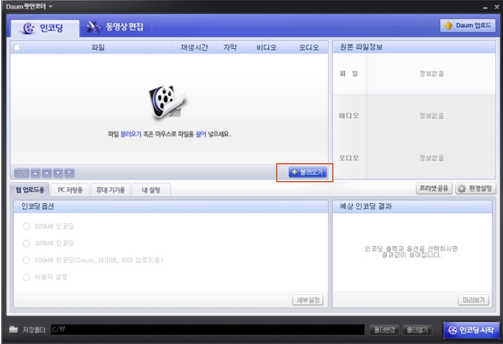 ▼ 프로그램 실행 후 [불러오기]를 클릭해 인코딩할 동영상을 불러옵니다.