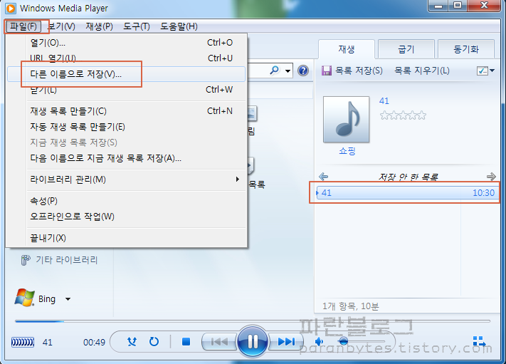 ▼ 이제 웹 페이지 내에 있던 음원을 내 PC의 media player에서 재생할 수 있고 저장도 가능합니다. 저장할 때에는 [파일]의 [다른이름으로 저장]을 클릭해 원하는 이름으로 수정하고 저장위치를 지정할 수 있습니다.