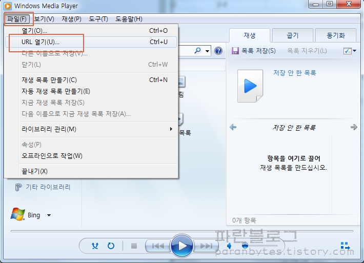 ▼ 윈도우미디어플레이어를 실행해서 [파일]의 [URL열기]를 클릭합니다. 파일 탭이 보이지 않으면 [구성] > [레이아웃] > [메뉴모음표시]에 체크하면 메뉴모음 줄이 표시됩니다.