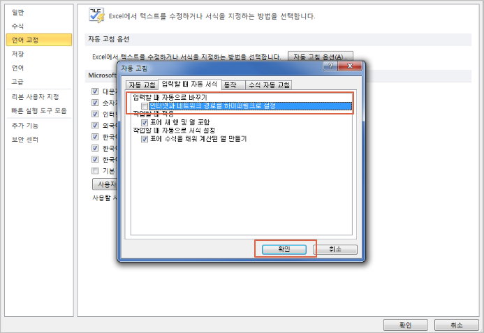 ▼ 입력할때 자동 서식 택에서 [인터넷과 네트워크 경로를 하이퍼링크로 설정]에 체크해제합니다.