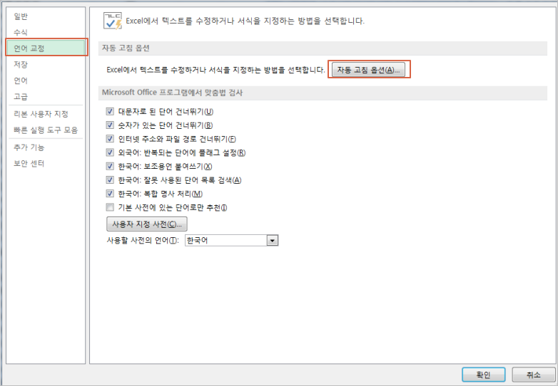 ▼ [언어교정]을 선택한 뒤 [자동 고침 옵션]을 클릭합니다.