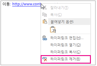 ▼ 하이퍼링크가 생성된 문자열에 마우스를 놓고 우클릭 후 [하이퍼링크 제거]를 클릭하면 링크만 제거되고 텍스트는 그대로 남게 됩니다.