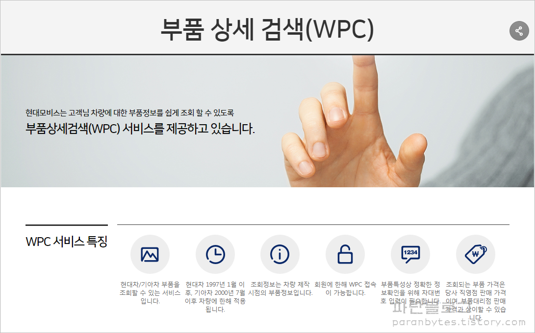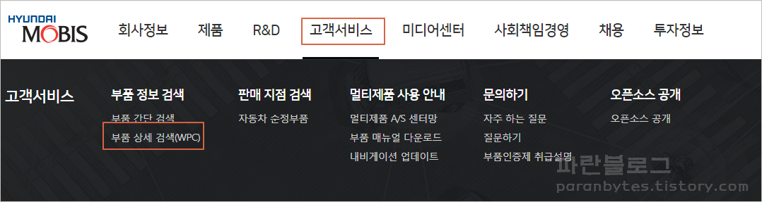 ▼ 현기부품몰 홈페이지 (www.mobis.co.kr)에 접속해서 고객서비스 메뉴의 부품상세검색 (WPC)를 클릭합니다.