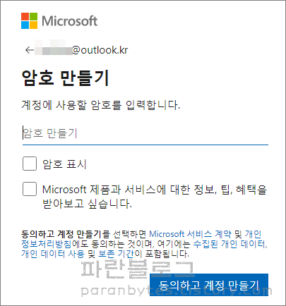 ▼ 문자와 숫자를 조합하여 비밀번호를 입력합니다. Microsoft 광고메일 수신을 원하지 않을때에는 두번째 체크박스를 비워둔 채로 [동의하고 계정만들기]를 클릭합니다.