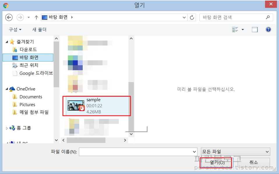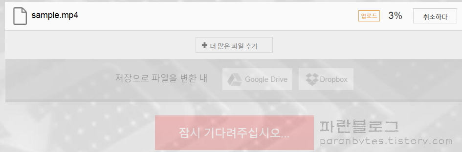 미리 준비해둔 mp4 형식의 샘플파일을 컴퓨터의 저장위치로부터 불러왔습니다. 파일명이 업로드되면 정상적으로 작업을 시작할 준비가 된것입니다.
