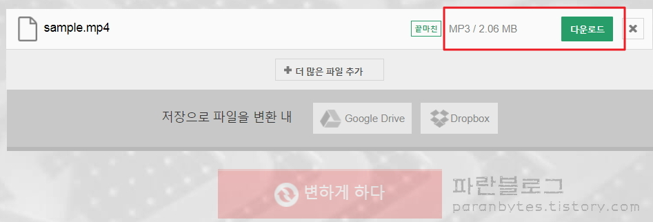 mp4 mp3 변환 작업이 완료되면 파일의 형식과 용량, 녹색의 다운로드버튼이 생성됩니다. 녹색버튼을 클릭해서 파일을 저장할 수 있습니다.