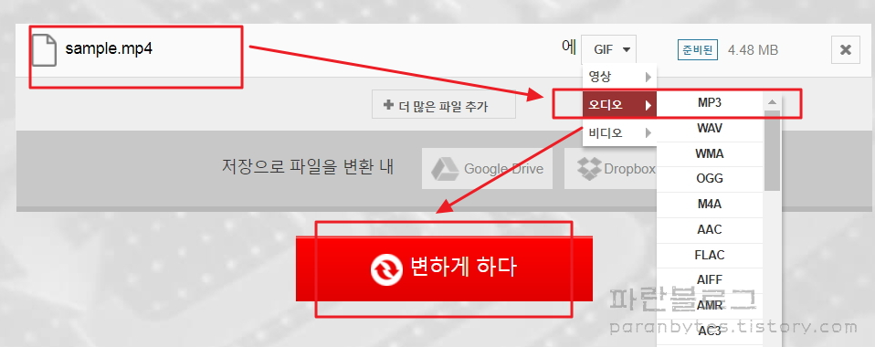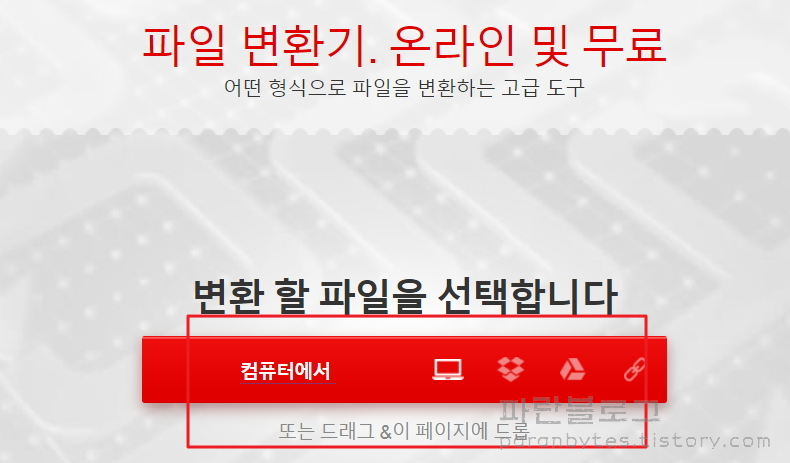 해당 사이트로 들어간 뒤 변환할 파일을 컴퓨터나 드롭박스, 구글드라이브 또는 URL 등 저장위치로부터 불러옵니다. 저장된 경로에서 불러오거나 파일을 드래그앤드랍을 통해 빈칸에 넣는 방법으로 불러올 수 있습니다.